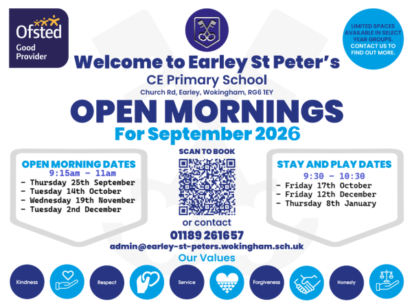 So, if you are interested in exploring the possibility of offering your child the first rate education we can provide at Earley St Peter’s Church of England Primary School, please make an appointment to meet the Head of School, Mr Tom Smith, for a tour of our wonderful school. This can be arranged by calling the School Office - 0118 9261657 or by email admin@earley-st-peters.wokingham.sch.uk