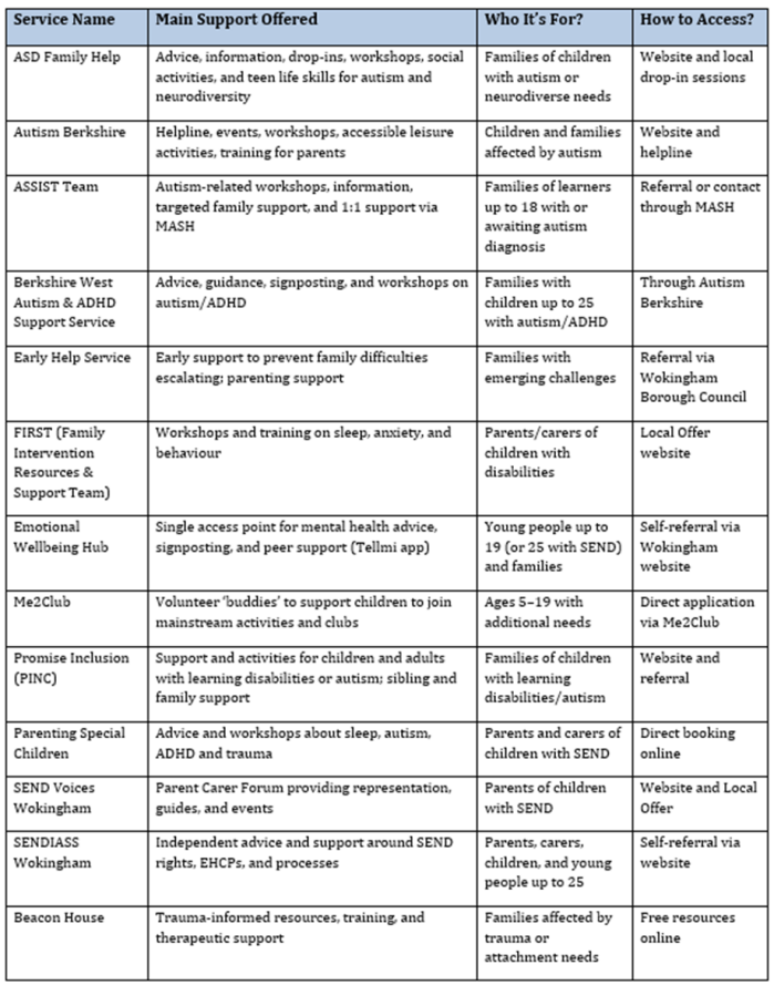 The following table summarises key local and national services that parents and carers can access for support, advice, and activities relating to children and young people with Special Educational Needs and Disabilities (SEND).